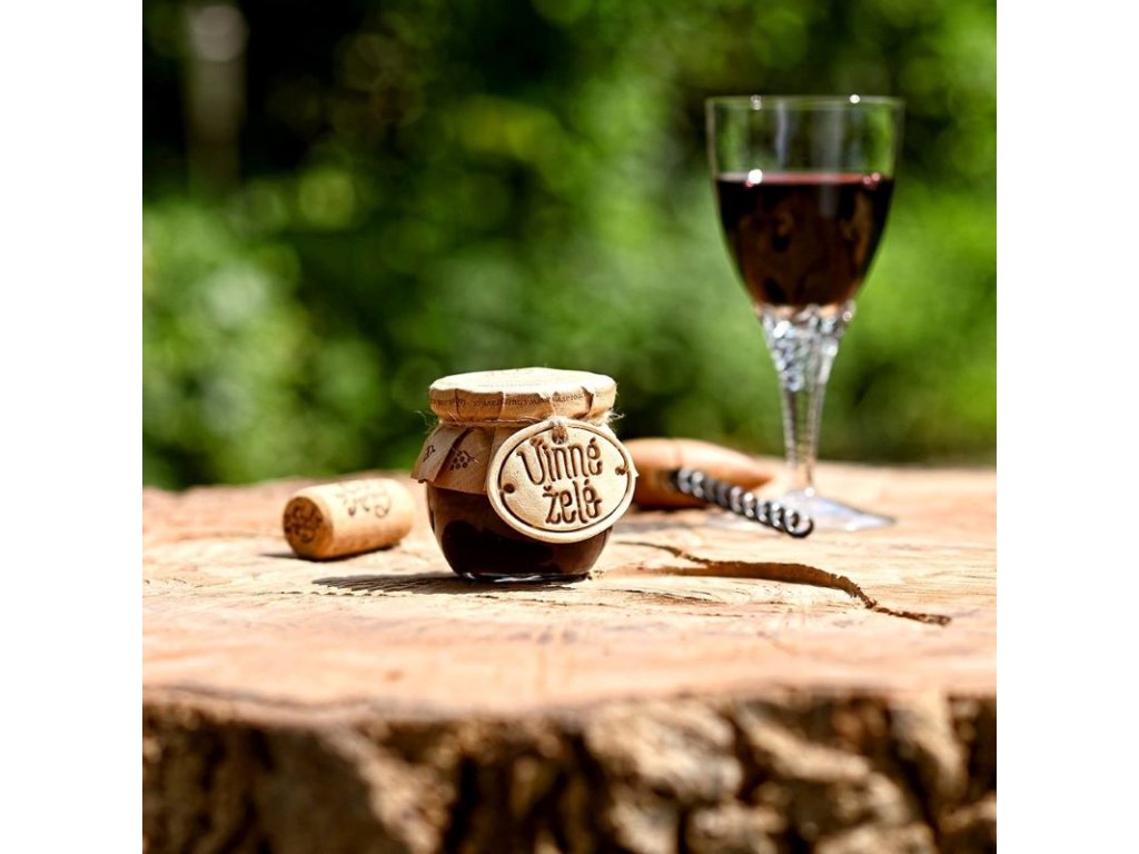 Vinné želé je delikatesa získaná želírováním vína, pomocí pektinu a cukru. V našem případě se jedná o kvalitní červené víno z Moravy, odrůdy Frankovka nebo Svatovavřinecké. Naše vinné želé vynikne především svou autentickou vůní a chutí vína, ze kterého je vyrobeno. Jemná struktura želé na jazyku, už jen umocní pocit nevšedního gurmánského zážitku. Konečně si tak můžete dopřát víno i k snídani.